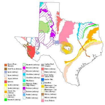 The Geologic Atlas of Texas illustrates the surface extent of geologic formations (and aquifers) across the state. The surface extent, or outcrop, of each aquifer is the area in which the host formations are exposed at the land surface. This area corresponds to the principal recharge zone for the aquifers. Groundwater encountered within this area is normally under unconfined, water-table conditions and is most susceptible to contamination. Some water-bearing formations dip below the surface and are covered by other formations. Aquifers with this characteristic are common, although not exclusive, east and south of Interstate Highway 35. Aquifers covered by less permeable formations, such as clay, are confined under artesian pressure. Delineations of the downdip boundaries of such aquifers as the Edwards (BFZ), Trinity, and Carrizo-Wilcox are based on chemical quality criteria.